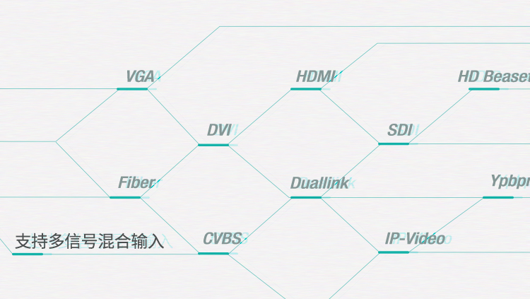 支持VGA、DVI、HDMI、SDI、CVBS、Ypbpr、Duallink、IP-Video、HDBaseT、Fiber等多信號混合輸入